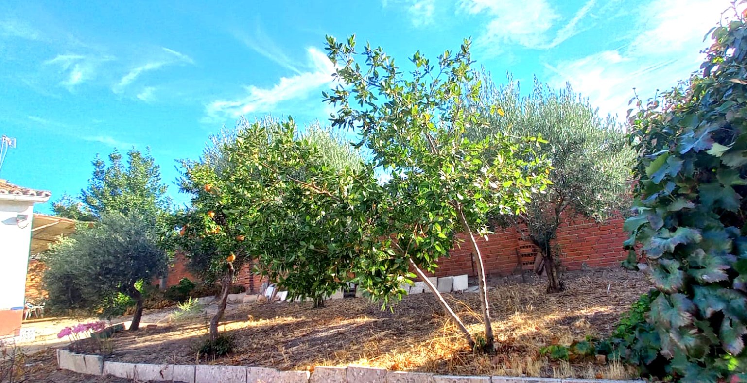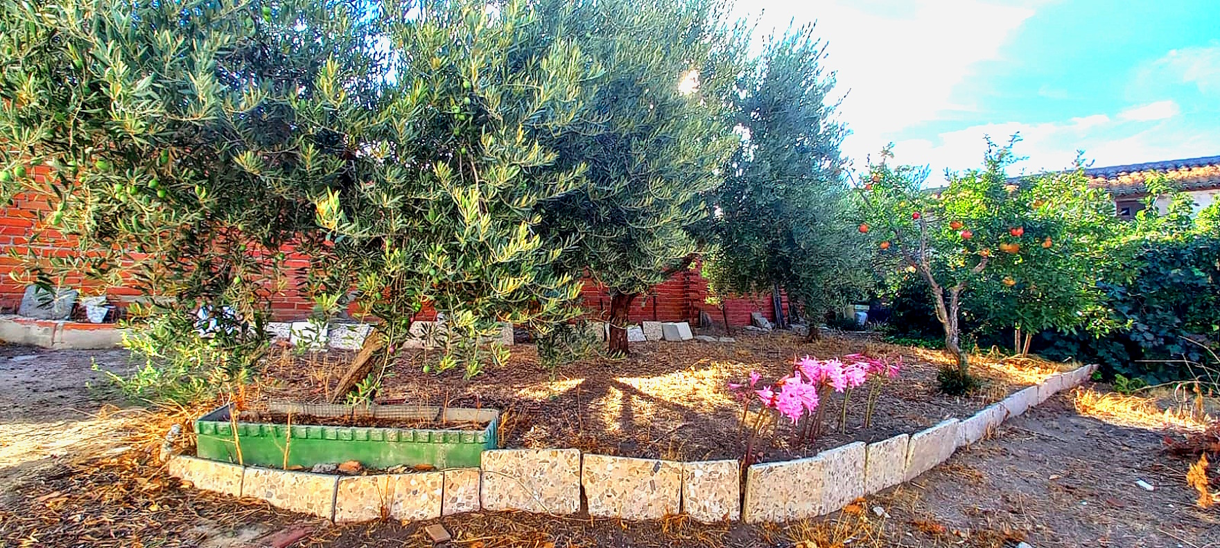 Hay terreno suficiente para ampliar plantaciones a su gusto, aunque cuenta con: jardín, árboles frutales, olivas, granados, higuera, laurel, gallinero, cocina, almacenes, pozo …