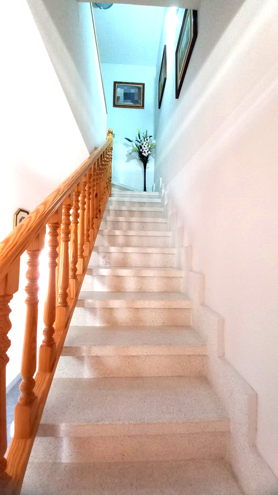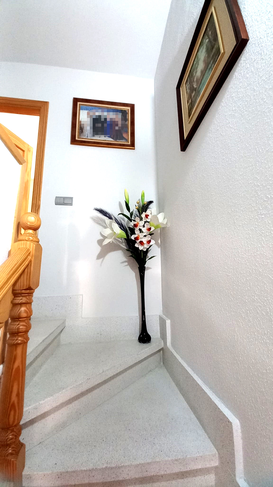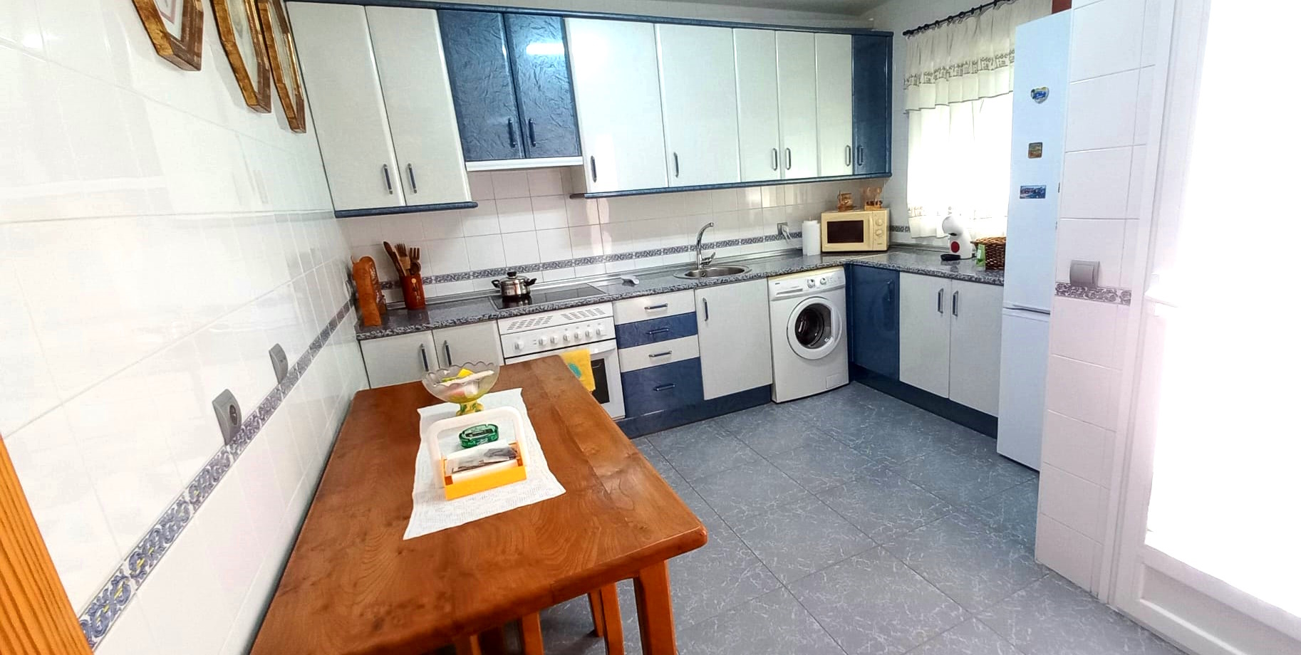 Se distribuye en pasillo de entrada, salón comedor con buena luminosidad, trastero bajo escalera, cocina completamente amueblada y equipada, dos baños completos (uno en planta baja con plato de ducha y otro en primera planta con bañera), y tres habitaciones dobles con armarios empotrados (habitación de matrimonio con balcón a la calle).
